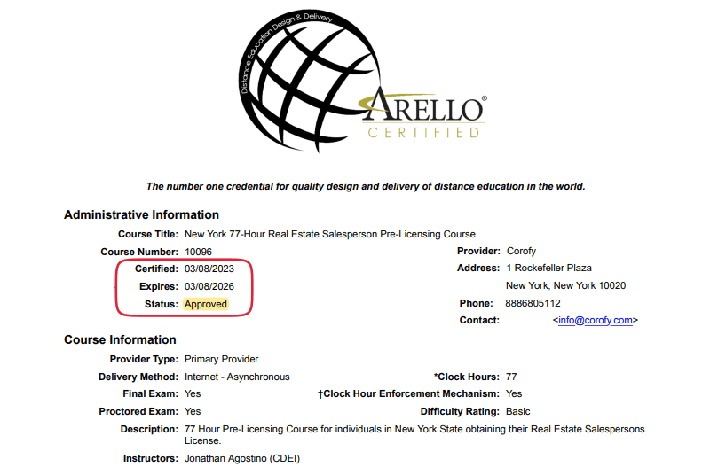 Absolutely! Corofy’s Real Estate Salesperson Pre-Licensing Course is fully approved by the New York Department of State (License Number: D01075). Our course and instructor are also accredited by Arello and IDECC. These certifications are only awarded to schools with A+ online education.